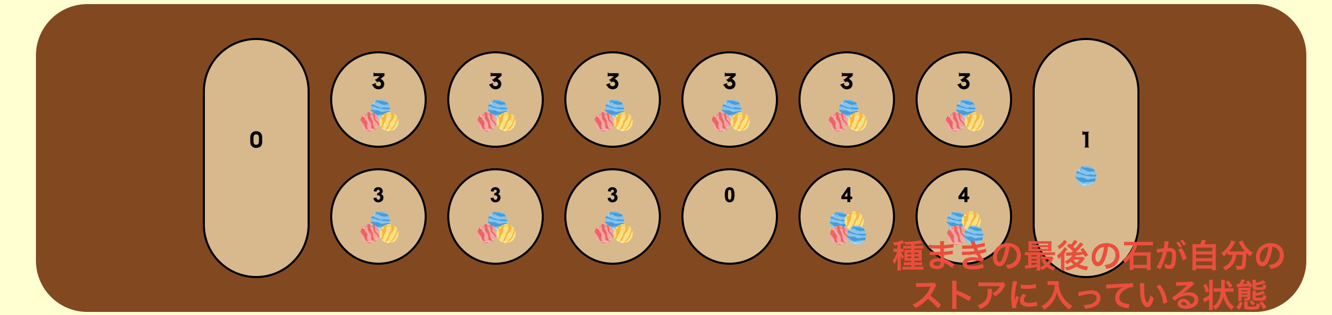 【連続操作条件】プレイヤーは移動した最後の石が自分のストアに入ったとき、連続で操作することができます。