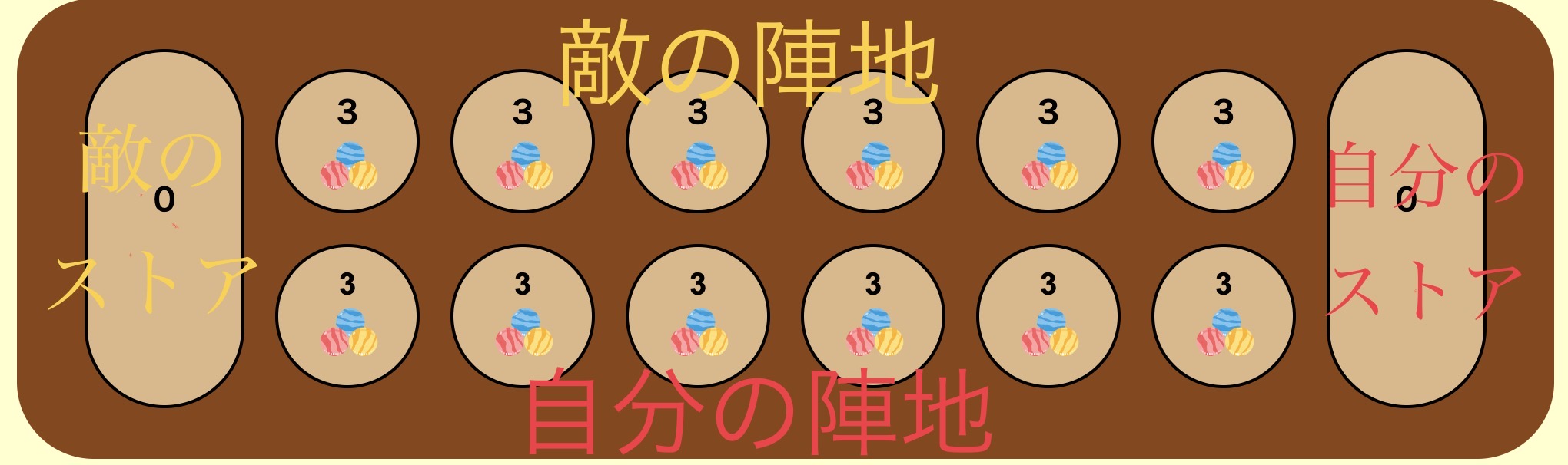 手前側の6マスを自陣、奥側の6マスを敵陣とします。また、左右にある楕円形のマスはストアと言います。