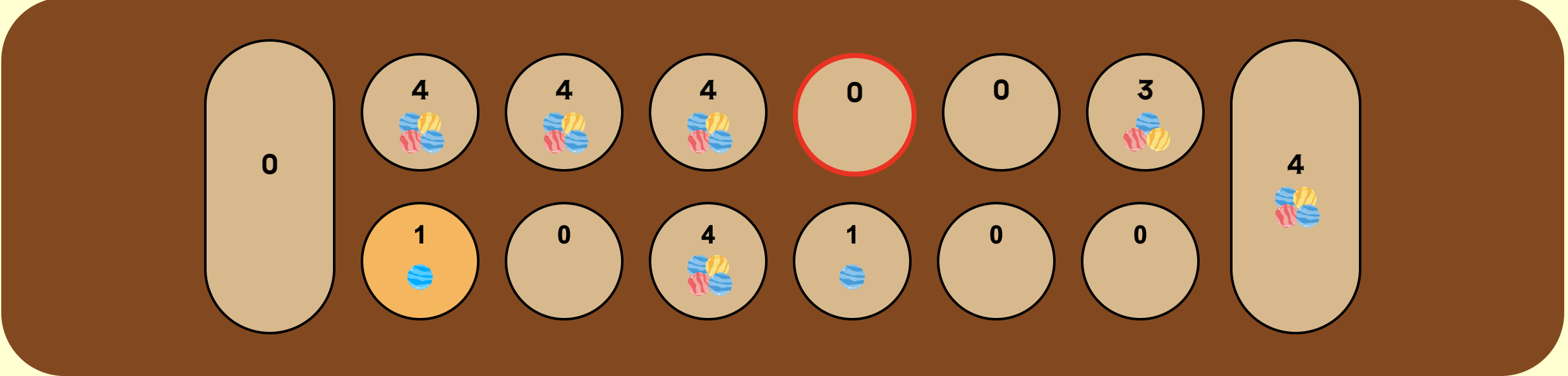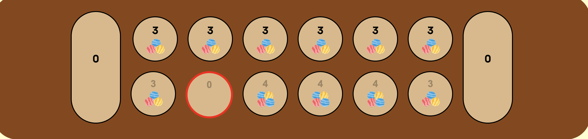 例えば以下の画像の場面では、自陣の一番左側のマスを選ぶとその隣の空のマスに最後の石が入るので